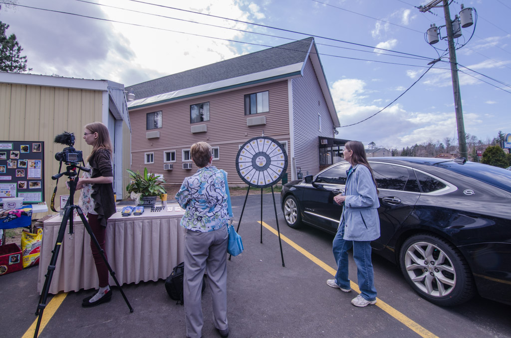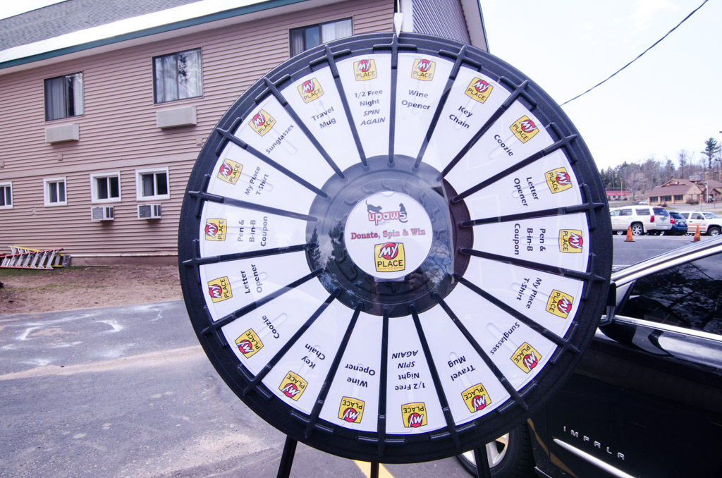 The Upper Peninsula Animal Welfare Shelter was also on site for the Grand Opening collecting donations from their UPAWS Wishlist. People donated money as well for a chance to take a spin the prize wheel. Gifts included free night stays, t-shirts, travel mugs, coozies, sunglasses, key chains, and wine bottle openers.
