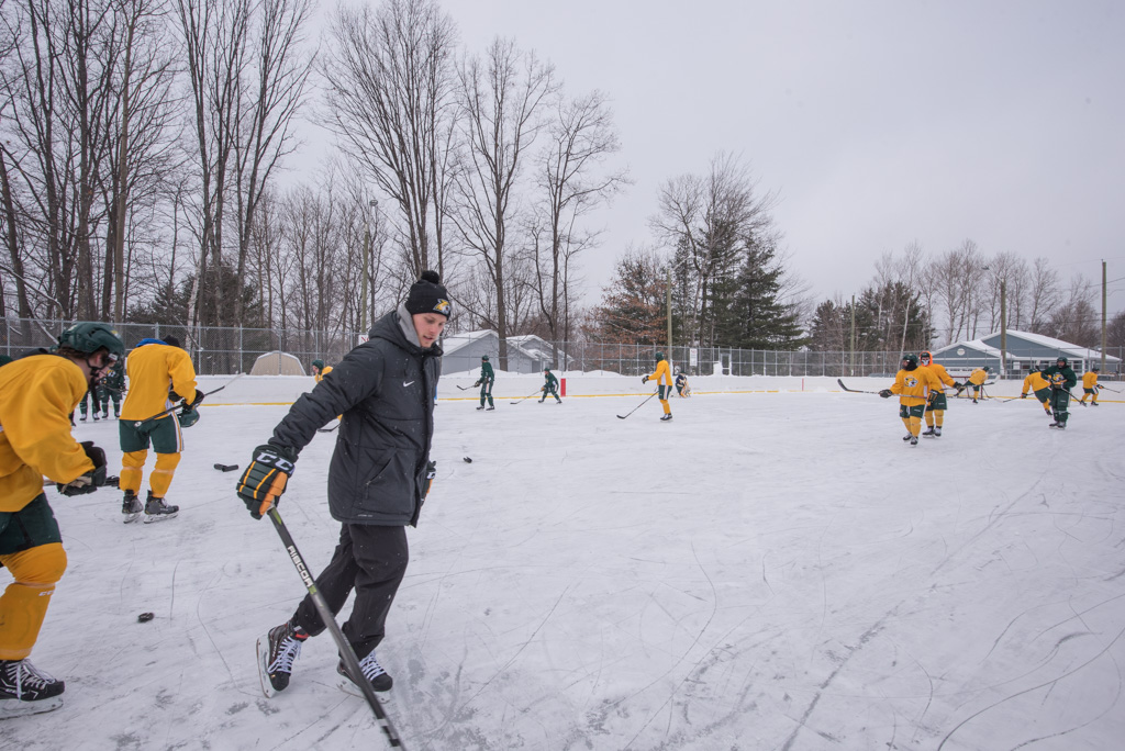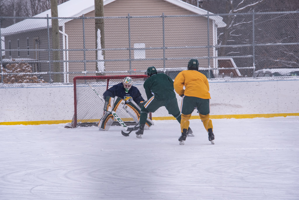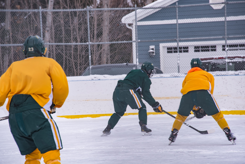 The team split up for some four-on-four intersquad hockey action on the outdoor ice rink while the community came out to watch the game and enjoy some hot cocoa! Both sides fought hard and had fun challenging each other on the ice, making for a great unique game the community could enjoy.